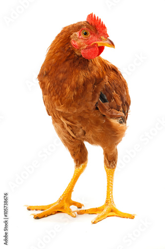 Fototapeta premium Mid-sized brown pullet standing on white