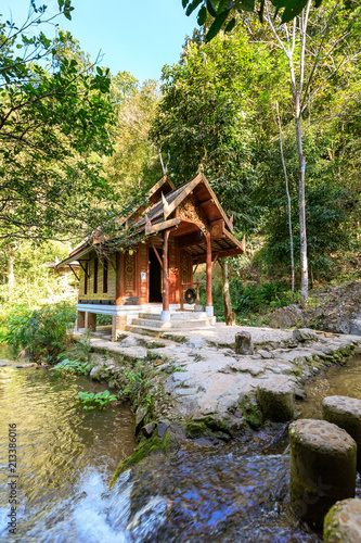 © wirojsid, Obraz premium Mid-stream chapel at Wat Khantha Phueksa temple in Mae Kampong village, Chiang Mai, Thailand