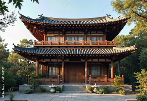 © Eliane, Fototapeta premium Midday Facade: A Close Shot of a One-Storied Building's Front, Captured at Noon on a Bright Day, Highlighting Architectural Details and Sunlight.