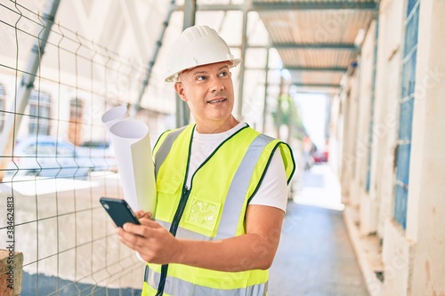 Fototapeta premium Middle age architect man using smartphone and holding blueprints at the city.