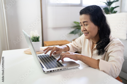 Fototapeta premium Middle age Asian woman Work from home. senior woman smiling Beautiful mature asian woman on laptop with technology concept
