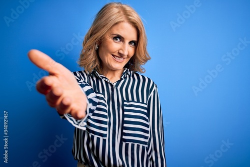 © Krakenimages.com, Fototapeta premium Middle age beautiful blonde woman wearing casual striped shirt standing over blue background smiling friendly offering handshake as greeting and welcoming. Successful business.