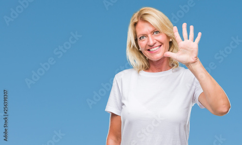 © Krakenimages.com, Fototapeta premium Middle age blonde woman over isolated background showing and pointing up with fingers number five while smiling confident and happy.