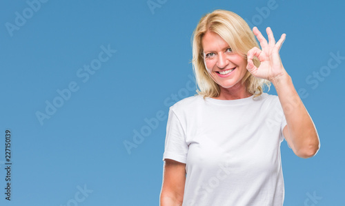 © Krakenimages.com, Fototapeta premium Middle age blonde woman over isolated background smiling positive doing ok sign with hand and fingers. Successful expression.
