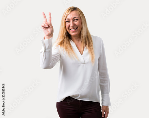 Fototapeta premium Middle age blonde woman with white shirt smiling and showing victory sign...