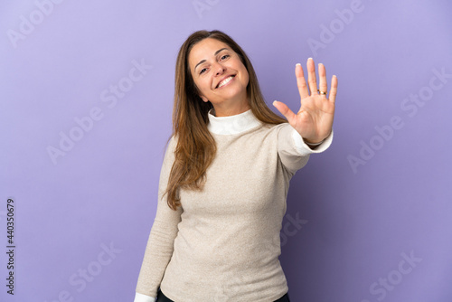 Fototapeta premium Middle age Brazilian woman isolated on purple background counting five with fingers