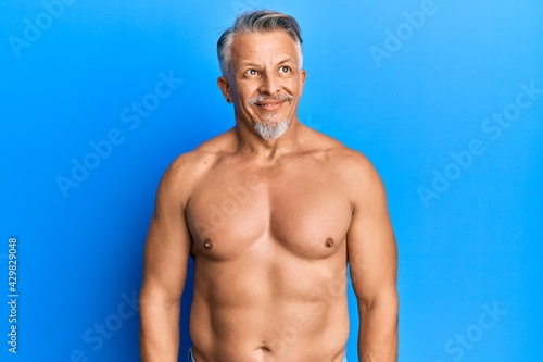 Fototapeta premium Middle age grey-haired man standing shirtless smiling looking to the side and...