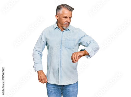 Fototapeta premium Middle age grey-haired man wearing casual clothes checking the time on wrist...