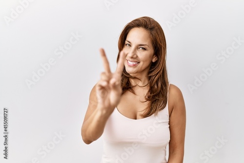 © Krakenimages.com, Fototapeta premium Middle age hispanic woman standing over isolated background showing and pointing up with fingers number two while smiling confident and happy.