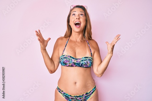 © Krakenimages.com, Naklejka premium Middle age hispanic woman wearing bikini crazy and mad shouting and yelling with aggressive expression and arms raised. frustration concept.
