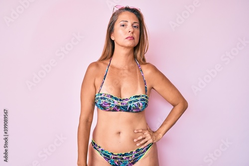 Fototapeta premium Middle age hispanic woman wearing bikini relaxed with serious expression on...