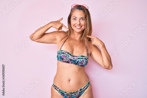 Naklejka premium Middle age hispanic woman wearing bikini smiling cheerful showing and...