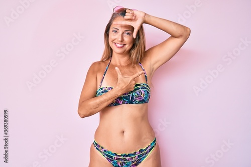 Obraz premium Middle age hispanic woman wearing bikini smiling making frame with hands and fingers with happy face. creativity and photography concept.