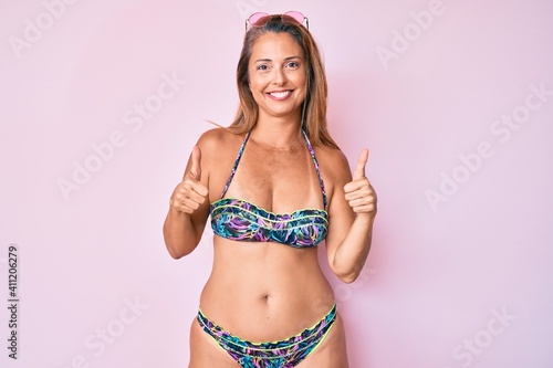 Naklejka premium Middle age hispanic woman wearing bikini success sign doing positive gesture with hand, thumbs up smiling and happy. cheerful expression and winner gesture.