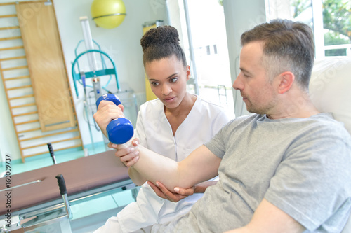 © auremar, Fototapeta premium middle age man in gym doing fitness exercises with dumbbells