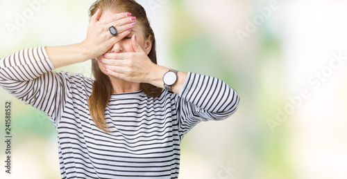 © Krakenimages.com, Fototapeta premium Middle age mature beautiful woman wearing stripes winter sweater over isolated background Covering eyes and mouth with hands, surprised and shocked. Hiding emotion