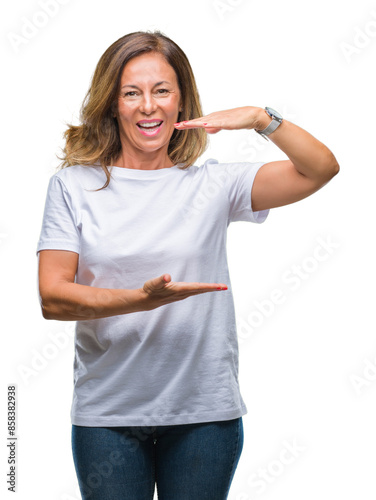 © Krakenimages.com, Fototapeta premium Middle age senior hispanic woman over isolated background gesturing with hands showing big and large size sign, measure symbol. Smiling looking at the camera. Measuring concept.