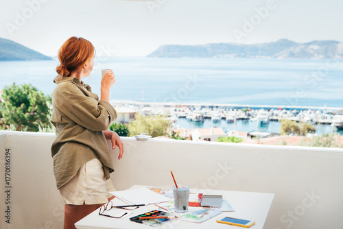 © Soloviova Liudmyla, Obraz premium Middle aged beautiful woman relaxing with Turkish coffee on sunny house terrace lit by morning sunlight, overlooking docks with yachts in Kas old town, Antalya province, Mediterranean Turkey.