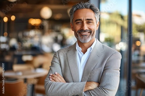 © kik, Fototapeta premium Middle Aged Businessman in Gray Suit Smiling Outdoors in Modern Café