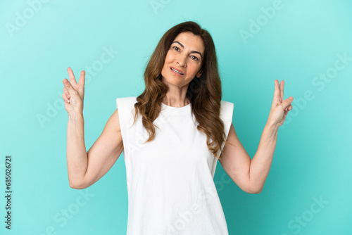 Fototapeta premium Middle aged caucasian woman isolated on blue background showing victory sign...