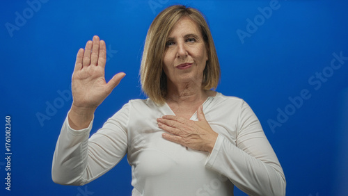 © Krakenimages.com, Fototapeta premium Middle-aged caucasian woman raising palm and placing hand on chest in studio against blue wall; sincerity.