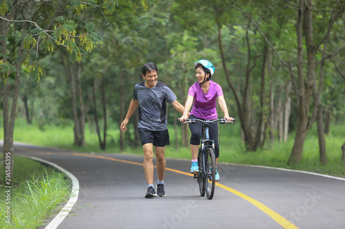 © toa555, Fototapeta premium Middle aged couple walking with their bicycle in park
