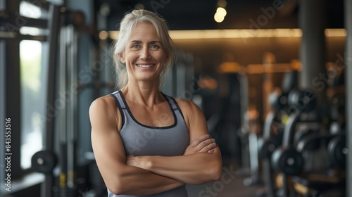 © gn8, Fototapeta premium Middle Aged Eastern European Female Fitness Trainer Smiling Confidently at the Gym with Crossed Arms
