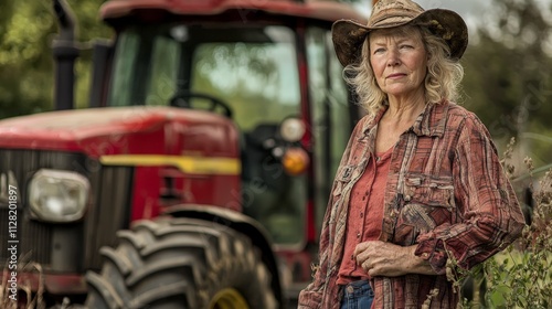 © Salander Studio, Obraz premium middle aged female farmer standing next to a tractor on a field