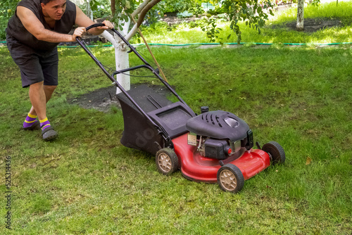 © Anna Ivanovska, Fototapeta premium middle aged handsome man wearing home clothes is cutting the lawn, process to cut the grass at the yard with special machine lawn mover, green garden