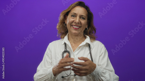 © Krakenimages.com, Fototapeta premium Middle aged hispanic woman doctor with stethoscope smiling and clapping hands in a purple studio; celebration.