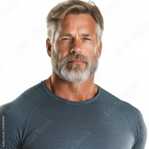 © sharafmaksumov, Obraz premium Middle Aged Man Exercising Isolated