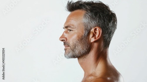 © sitifatimah, Obraz premium Middle-aged man gazes ahead, displaying mature confidence, self-assured strength, minimalist background, bright lighting.