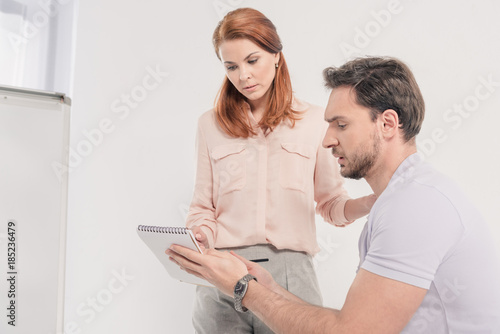 © LIGHTFIELD STUDIOS, Obraz premium middle aged man holding notebook and showing his notes to psychoanalyst