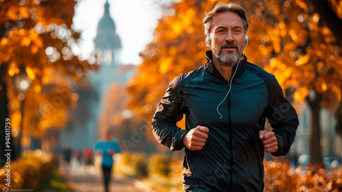 © Julia, Obraz premium Middle-aged Man Jogging in a Park, Embracing Fitness and an Active Lifestyle