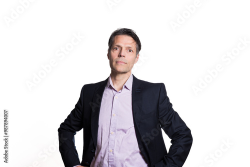© arieldufey, Fototapeta premium Middle-aged man looking at the camera, on white background, wearing formal clothes.