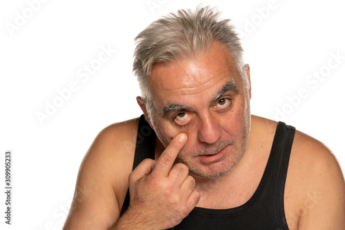 Obraz premium middle aged man pilling his lower eyelid on white background