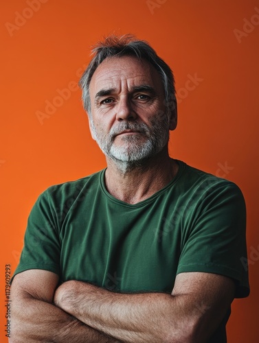 © The 2R Artificiality, Fototapeta premium Middle-aged man with gray beard wearing green shirt poses confidently against vibrant orange background showcasing ample copyspace for text.