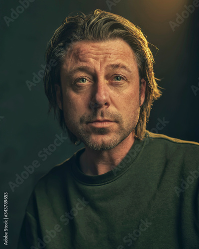 © ysbrandcosijn, Fototapeta premium Middle aged man with stubble beard in green sweater.