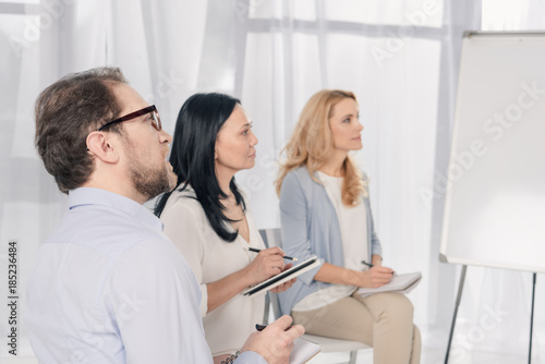 Fototapeta premium middle aged people with notebooks looking away while sitting at anonymous group therapy