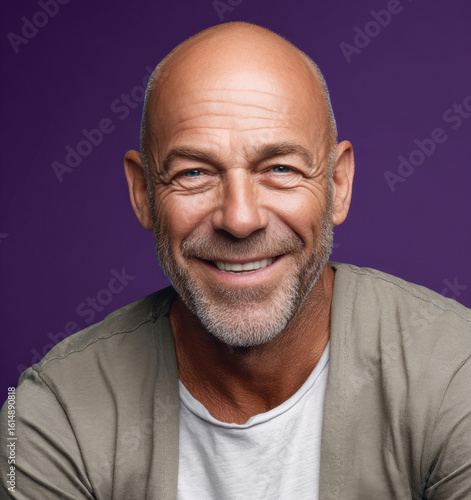 © Niks Ads, Obraz premium middle aged smiling man standing against purple background
