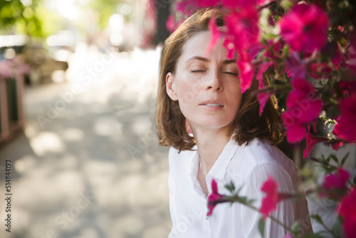 © ulza, Fototapeta premium middle aged woman against the background of petunya flowers relaxed outdoors. copy space. Slow life. Enjoying the little things. spends time in nature in summer