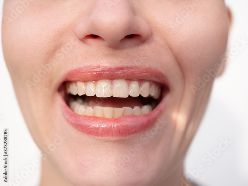 © galitsin, Obraz premium Middle aged woman laughs on white background showing perfect white teeth