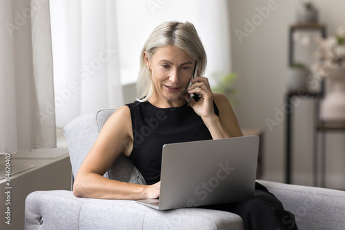 Fototapeta premium Middle-aged woman sit on armchair lead formal conversation, buy on-line, make order using laptop. Electronic commerce client receive consultation by phonecall hold smartphone spend time at home. Tech