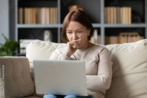 Fototapeta premium Middle-aged woman sit on sofa holds on lap laptop looks at pc screen feels concerned, need repair or help with program, older generation having difficulties and barriers of modern tech devices concept