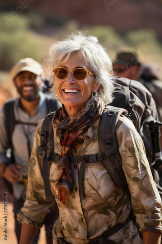 © ART_ist, Fototapeta premium Middle-aged woman tourist with backpack hiking in the mountains