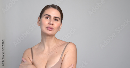 © Chiralli, Obraz premium Middle Aged Woman White Background. Female 40 Year Lady Looking At Camera Smiling. Concept of Enjoying Her natural beauty, High Self Esteem, Wellness. Natural Cosmetic Skincare Products.