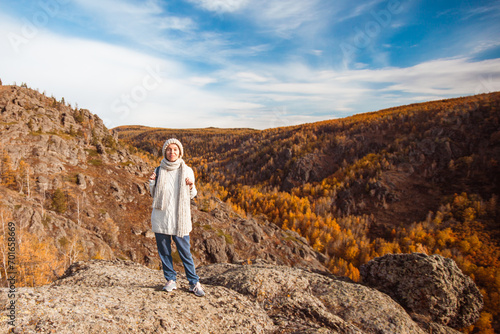 © Tatyana Gladskih, Naklejka premium Middle Aged Woman with backpack walking in the autumn forest trip