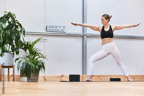 Obraz premium middle-aged woman with good physical doing the yoga warrior pose