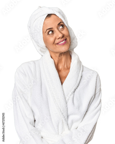 Obraz premium Middle-aged woman with towel post-shower in studio dreaming of achieving goals and purposes