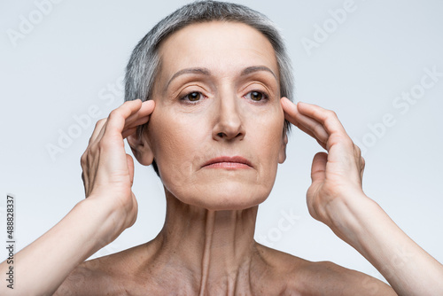 Fototapeta premium middle aged woman with wrinkles isolated on grey